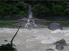 河川水は、飛騨川 (益田川) から水路を使って導入しています。益田川は、このところの雨で増水して流下してくるごみが多く、飼育池のスクリーンが詰まりやすい状況です。27