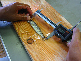 採捕した計 1537 個体は、体サイズを測定または個体数を記録した後、調査区間内に戻しました。秋にも同じ区間で調査を行う予定です。