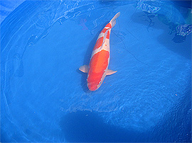 山県市で錦鯉の品評大会が行われ、当研究所の職員が審査員を務めました。出品された鯉はいずれもすばらしい鯉でした。特に、全体総合優勝に輝いた紅白は、体形、色彩、模様いずれも申し分なく、ナンバーワンとしての風格がありました。