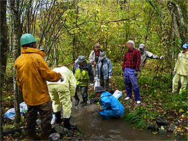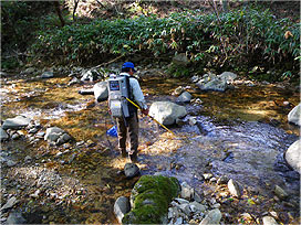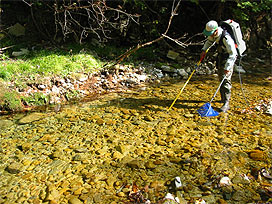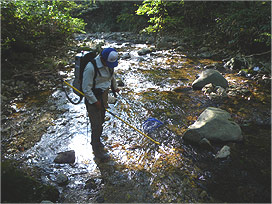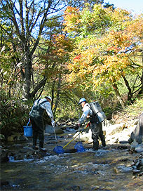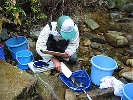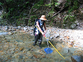 渓流で魚類調査