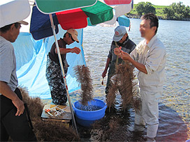 受精卵を産卵基質 (シュロ) に付着させる作業 |
