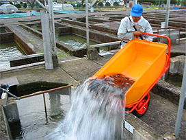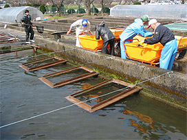 毎年冷水病に感染させて、生き残ったアユを親にすることによって、冷水病に対する抵抗性を高めようという取り組みです。当初は冷水病に感染させるとほとんど死んでしまいましたが、最近は、8