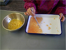 されたアユの卵は 2〜3 日ほどで発生能力が低下してしまうので、定期的にアユの人工授精を行わなくてはいけません。本所の屋根の軒下を利用して、人工受精作業を行いました。