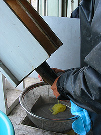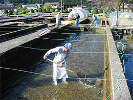 親魚の選別作業 (成熟が完了した個体を