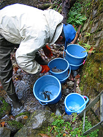 発眼卵を小分けして入れながら