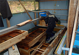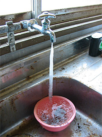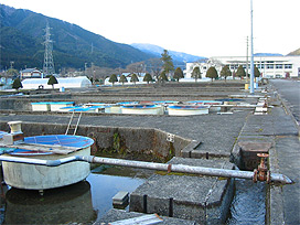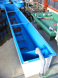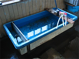 下呂支所では、カジカの飼育はタライを改造した水槽で行っています。