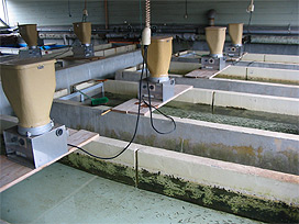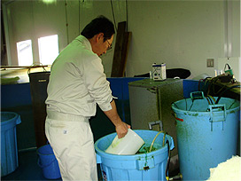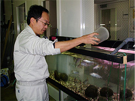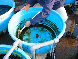 人間と同じく、魚も小さい頃はいろいろな病気にかかりやすいため、屋外の池とは隔離して飼育しています。ふ化室では、池の掃除と餌の補給が欠かせない日課となっています。
