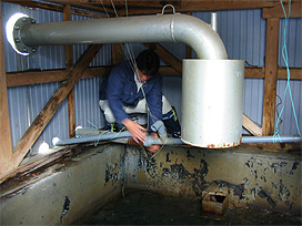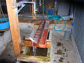 (益田川) の伏流水のため、河川水位の低下する冬期には井戸の水位も低下します。さらに、冬から春にかけては、アマゴやヤマメなどの稚魚の餌付けやカジカの産卵の時期にあたり、井戸水の使用量が増加することから、たびたび井戸水の供給量がひっ迫することがあります。そのため、この時期には、揚水量が少なく普段は使わない井戸をくみ上げて、不足しがちな井戸水の足しにします。