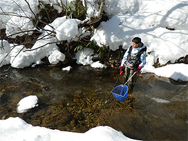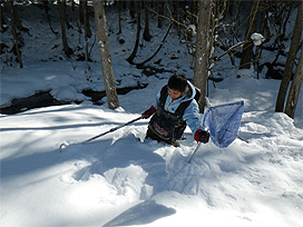 冬季の凍った河川で越冬している渓流魚の調査を行いました。