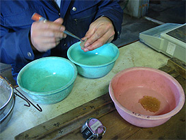 カジカは、雄親が石の下に巣を作り、そこへ雌親が次々とやってきて卵を産み付けます。下呂支所では、巣の材料として瓦や鉄材を使っています