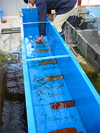 カジカは、ふ化から 1 ヶ月半ほどの間は人工海水の中で飼育します。採卵作業
