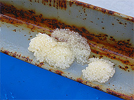 鉄製アングル材の裏側に産み付けられた卵