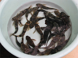 飼育水槽に移したカジカの仔魚 |