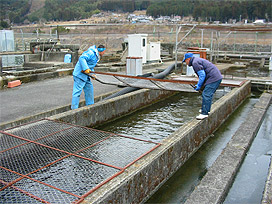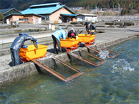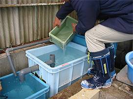 計数しながら 新しい飼育池に魚を投入