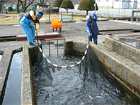 下呂支所では、屋外の飼育池でアマゴやニジマスなどを飼育しています。魚が混みあっている飼育池では病気が発生しやすくなるので、個体数や体サイズに応じて、より大きい池に移し替えるか、いくつかの池に分けて飼育するようにしています。