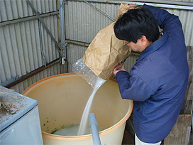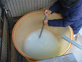 内陸部にある当研究所では海水を採取することができないので、カジカの仔稚魚の飼育には人工海水を用いています。人工海水は、食塩