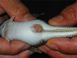 今のところ、下呂支所で飼育しているサケ科魚類での出現はニジマスだけで、アマゴやイワナでは発見されていません。