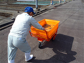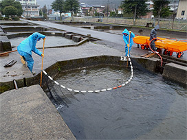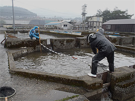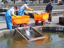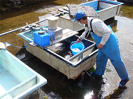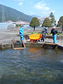 下呂支所では、屋外の飼育池でアマゴやニジマスなどを飼育しています。魚が混みあっている飼育池では病気が発生しやすくなるので、個体数や体サイズに応じて、より大きい池に魚を移し替えるか、いくつかの池に分けて飼育するようにしています。