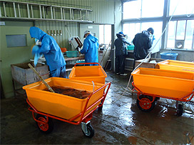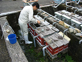 これらの作業は 「検卵」 と呼ばれ、卵の出荷やふ化室への移送の前に必ず行っています。検卵が終了した発眼卵は、養殖業者への出荷や当研究所での継代飼育などに使用しています。
