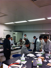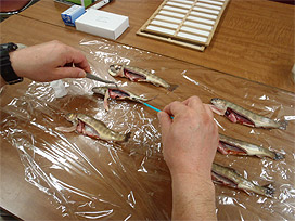 昨年、アユの側線上方横列鱗数の計数マニュアルを当研究所のホームページで公開させていただいた後、成果報告会で判別事例をご紹介させていただいたところ、いくつかの漁協さんからご要望がございましたので、側線上方横列鱗数と下顎側線孔によるアユの簡易な個体判別技術の講習会を本所で開催したところ、漁業協同組合等から