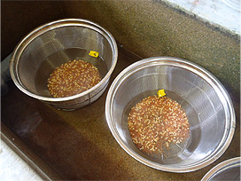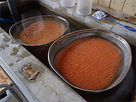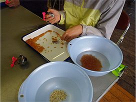 生卵 (右側のざる) との分別作業 |