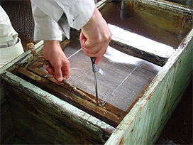 と呼ばれる枠付きの金網に発眼卵を小分けして入れます。ふ化盆は、いくつか重ねた状態で上下を針金で固定し、ふ化水槽の中に設置します。ふ化水槽では、井戸水を流してふ化盆の中で発眼卵をふ化させた後、仔魚期の終わりまで収容しています。