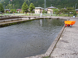 下呂支所では、昨日に引き続き、当番の職員が飼育池のスクリーンの掃除や給餌機への餌の補充などを行いました。