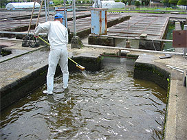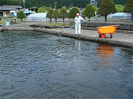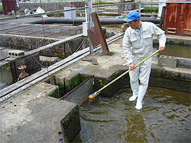 下呂支所では、当番の職員が飼育池のスクリーンの掃除や給餌機への餌の補充などを行いました。