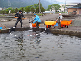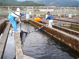 下呂支所では、屋外の飼育池でアマゴやニジマスなどを飼育しています。魚が混みあっている飼育池では病気が発生しやすくなるので、個体数や体サイズに応じて、より大きい池に移し替えるか、いくつかの池に分けて飼育するようにしています。