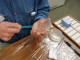 ニジマスの発眼卵の検卵作業