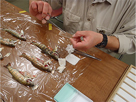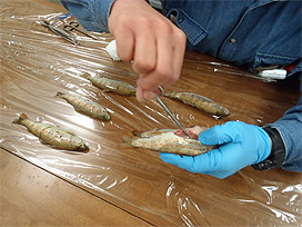 診断の依頼があったのはアマゴとイワナです。養殖場は、自然界よりも高い密度で魚を飼育しており、病気が蔓延すると大きな被害が出る恐れがあるので、原因の把握と適切な対応が不可欠です。当研究所では、寄生虫