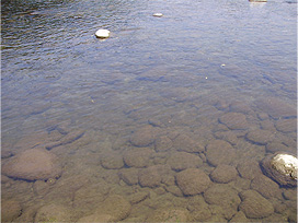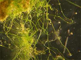河川で藻類が異常に繁茂していると連絡があったので、河川調査を行いました。現地では、糸状の藻類の繁茂が確認されたので、一部を採取し、研究所に持ち帰って調べました。その結果、緑藻のヒビミドロの仲間であることが判明しました。この藻類は、普通に見られる藻類で、今年の気象条件が繁茂しやすい環境であったために増えたと考えられました。