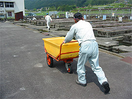 ふ化室では、まず 「ふ化盆 (ふかぼん)」