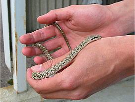 採捕したアオダイショウは、写真撮影後に近くの草むらに逃がしました