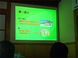 今年はアユに関する知識を深めるために総会終了後に講演会が計画されました。当研究所に講演依頼があったため、「アユの生態と習性」