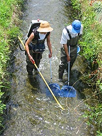本降りの雨の中、飛騨市内の農業用排水路で魚類調査を行いました。3