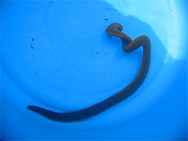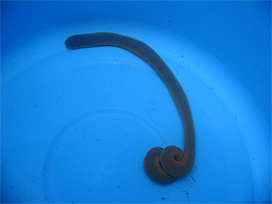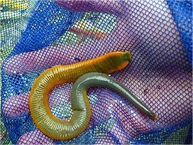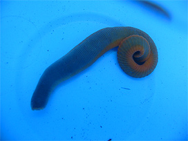クガビルは、ミミズを専門的に捕食するヒルで、吸血性ではなく人畜無害です。ただし、ネイビーブルーにオレンジという不調和な配色に、伸縮を繰り返したり自在に渦を巻いたりする落ち着きのなさが相まって、その気色悪さは群を抜くものがあります。