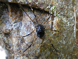 節足動物門鋏角亜門クモ綱ザトウムシ目に属しており、クモに近い生物ではありますが、頭胸部と腹部が見た目ではっきり分かれているクモとは異なり、体が一体化しているように見えるため、はっきり違いがわかります。また、歩き方も、クモとはちがう感じです。いろいろな色・大きさのザトウムシに会いますが、ウィキペディアによれば世界で約