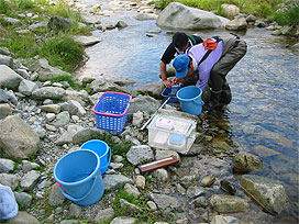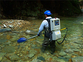 渓流での調査中、今まで見たことのない生物を発見しました。全長