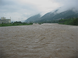 下呂支所の横を流れる益田川 (飛騨川) も水位が高い状態が続いています。空梅雨では飼育池の用水が不足して困るのですが、増水が続くと魚類調査が予定通りに実施できなくなってしまいます。悩ましいところです。