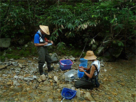 採捕した計 259 個体は、体サイズを測定した後、調査区間内に戻しました。