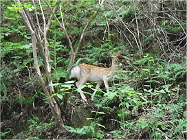 調査中にばったりであったニホンジカ (Cervus nippon) です。数頭の群れの中で 1 頭だけ逃げずに近距離から撮影することができました。