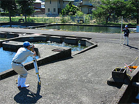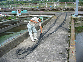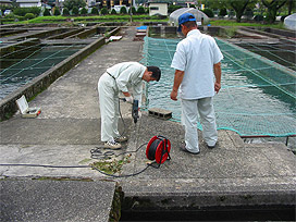 下呂支所の飼育池で、金網製の防鳥ネットが老朽化したため、漁網を利用した新しい網と交換しました。