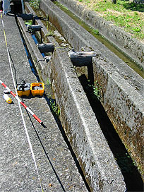 34 年 (1959 年) に竣工したものです。建設からすでに半世紀を過ぎて老朽化が進み、コンクリート壁が何ヶ所も破損しているため、修繕が必要な状況です。今日の作業では、破損箇所の詳細を把握するため、現場の測量を行いました。