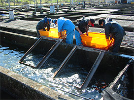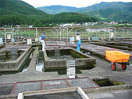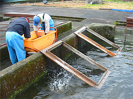 下呂支所では、屋外の飼育池でアマゴやニジマスなどを飼育しています。魚が混みあっている飼育池では病気が発生しやすくなるので、個体数や体サイズに応じて、より大きい池に魚を移し替えるか、いくつかの池に分けて飼育するようにしています。