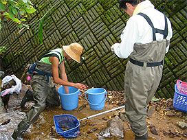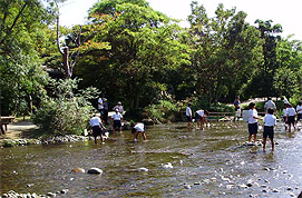 「カワゲラウォッチング」 が開催されました。河川環境楽園内を流れる人工河川「じゃぶじゃぶの河原」にて、水生生物を採集・同定し、水質指標生物の有無から、有機的な川の汚れ具合を学習しました。当研究所の職員は水生生物の同定のお手伝いをしました。