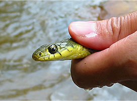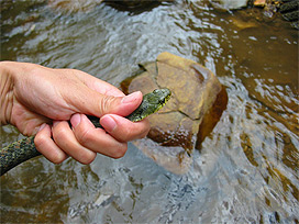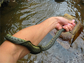渓流での調査中、ヤマカガシ (Rhabdophis tigrinus) と遭遇しました。本種はおとなしい性格ですが、毒を持っているために注意が必要です。