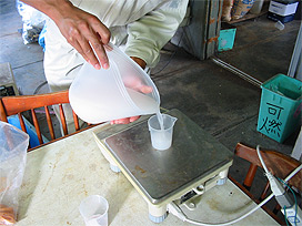 雄から摘出した精巣を破砕し、人工精漿で希釈 |