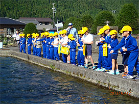 カジカとニジマスを見学してから、大きな親ニジマスに手撒きで餌を与えました。始めは恐る恐る餌を与えていた児童もいましたが、しばらくすると慣れて、楽しんで餌を与えていました。また、当研究所の職員が