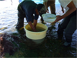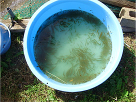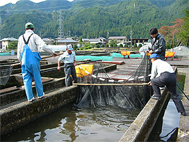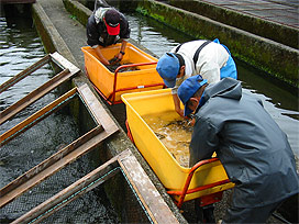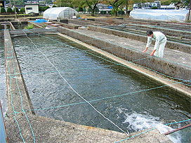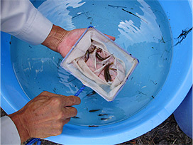 本所では、アユの冷水病被害を軽減するために、冷水病に強いアユ種苗の開発を行っています。毎年、冷水病原因菌に感染させて、生き残ったアユを親にすることによって、冷水病に対する抵抗性を高めようという取り組みです。